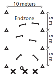 Field: Divide with cones into 5×10 meter rectangles (final rectangle is the endzone).