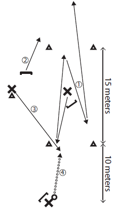 The runner cuts back and forth between the two cones, attempting to get separation from the primary defender.