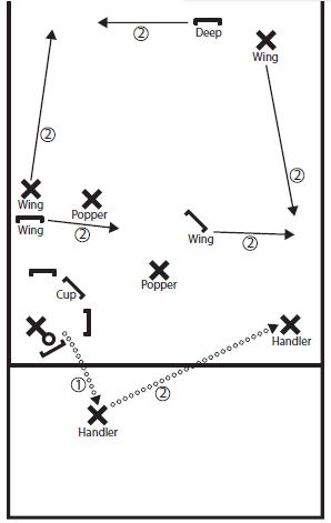 Offense: 2 offensive wings spread wide, keeping the field big. When the disc comes to their sideline → they cut in to receive a pass. When the disc is on the opposite sideline → they fall back and look for deep options.