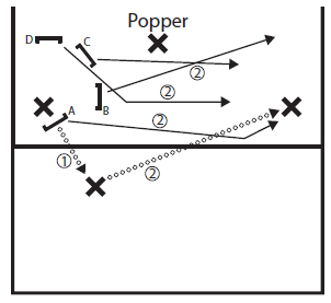 When a throw is made through the cup to a popper, many offensive players would immediately try to throw the disc upfield. However, there are usually other defenders blocking these upfield throws. A moment of confusion will ensue, allowing the cup to catch up. For the offense it’s often better, after a throw through the cup has been made, to pass the disc horizontally away from the cup. If this is done quickly enough, the cup will not be able to catch up and the offense can safely work the disc up the field. Practise this idea and engrain it in the muscle memory of the players if there are two poppers i.e. whenever a pass is made through the cup, the popper that received the disc should immediately pass it to his fellow popper.